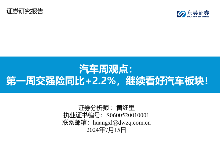 【东吴证券】【20240715】汽车周观点:第一周交强险同比+2.2%,继续看好汽车板块!-28页