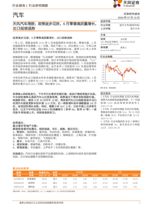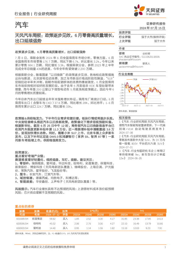 【天风证券】【20240715】天风汽车周报:政策逐步见效,6月零售高质量增长,出口延续强势-15页