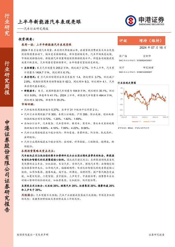 【申港证券】【20240716】20240716-申港证券-汽车行业研究周报:上半年新能源汽车表现亮眼-10页