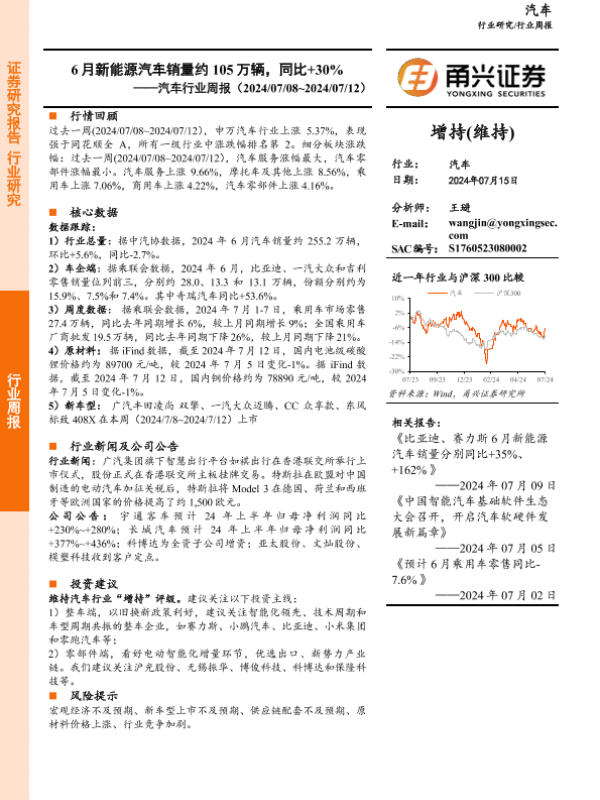 【甬兴证券】【20240715】20240715-甬兴证券-汽车行业周报:6月新能源汽车销量约105万辆,同比+30%-13页