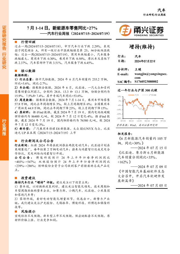 【甬兴证券】【20240722】20240722-甬兴证券-汽车行业周报:7月1-14日,新能源车零售同比+27%-13页
