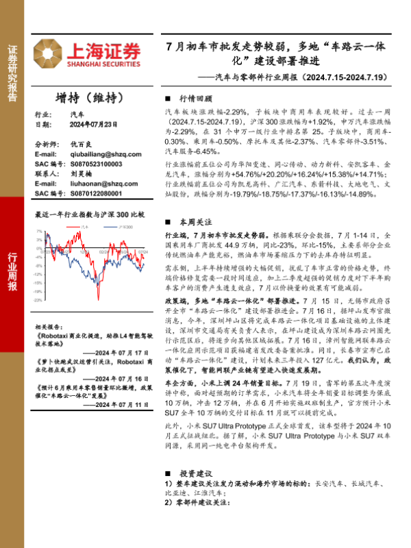 【上海证券】【20240723】20240723-上海证券-汽车与零部件行业周报:7月初车市批发走势较弱,多地“车路云一体化”建设部署推进-11页