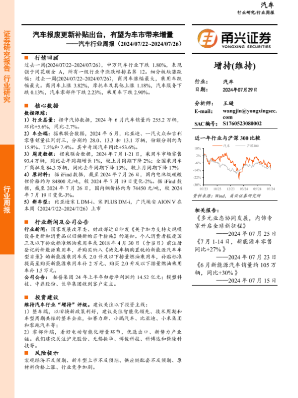 【甬兴证券】【20240729】汽车行业周报:汽车报废更新补贴出台,有望为车市带来增量-13页