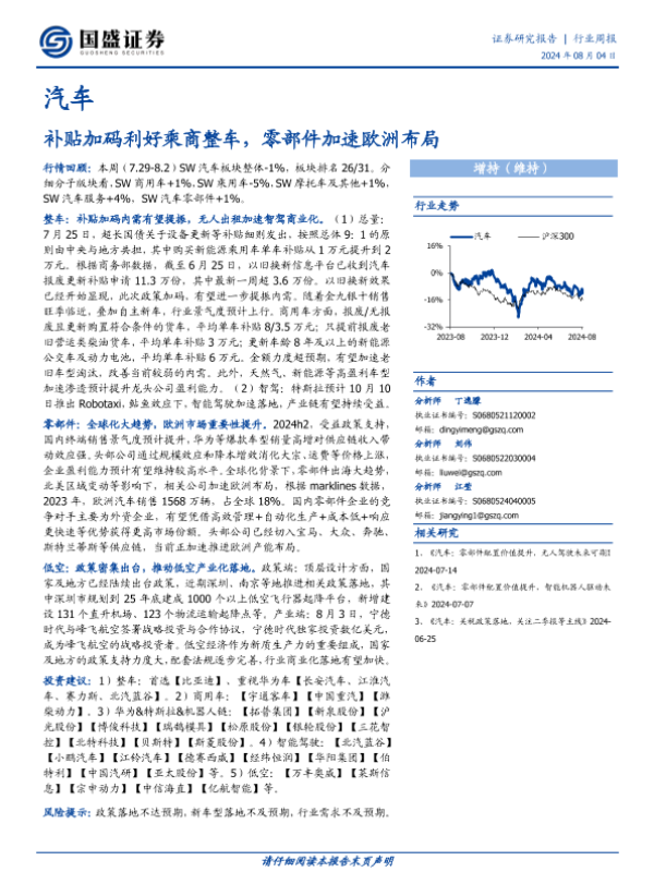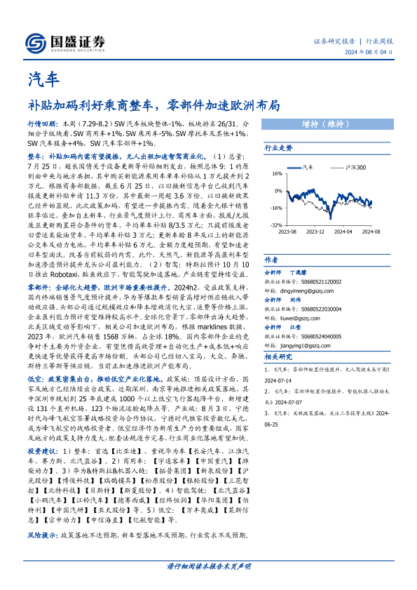 【国盛证券】【20240804】20240804-国盛证券-汽车行业周报:补贴加码利好乘商整车,零部件加速欧洲布局-22页