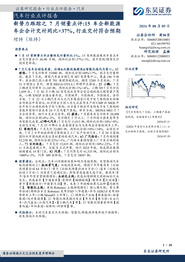 【东吴证券】【20240805】20240805-东吴证券-汽车行业点评报告:新势力跟踪之7月销量点评:15车企新能源车企合计交付同比+37%,行业交付符合预期-10页