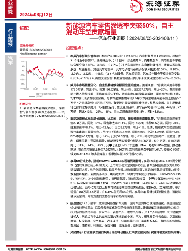 【东海证券】【20240812】20240812-东海证券-汽车行业周报:新能源汽车零售渗透率突破50%,自主混动车型贡献增量-16页