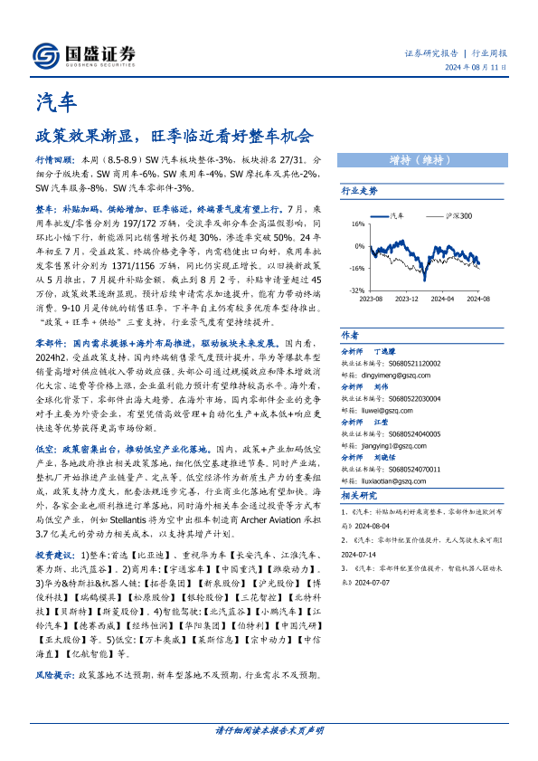 【国盛证券】【20240811】20240811-国盛证券-汽车行业周报:政策效果渐显,旺季临近看好整车机会-17页