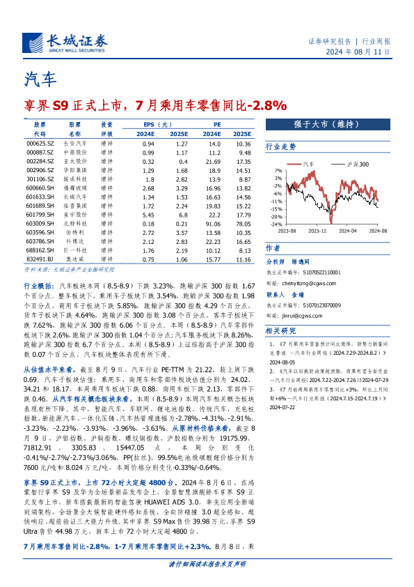 【长城证券】【20240811】20240811-长城证券-汽车行业周报:享界S9正式上市,7月乘用车零售同比-2.8%-14页