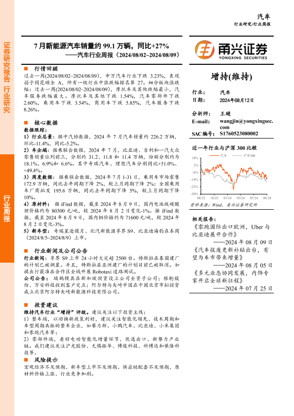 【甬兴证券】【20240812】20240812-甬兴证券-汽车行业周报:7月新能源汽车销量约99.1万辆,同比+27%-12页