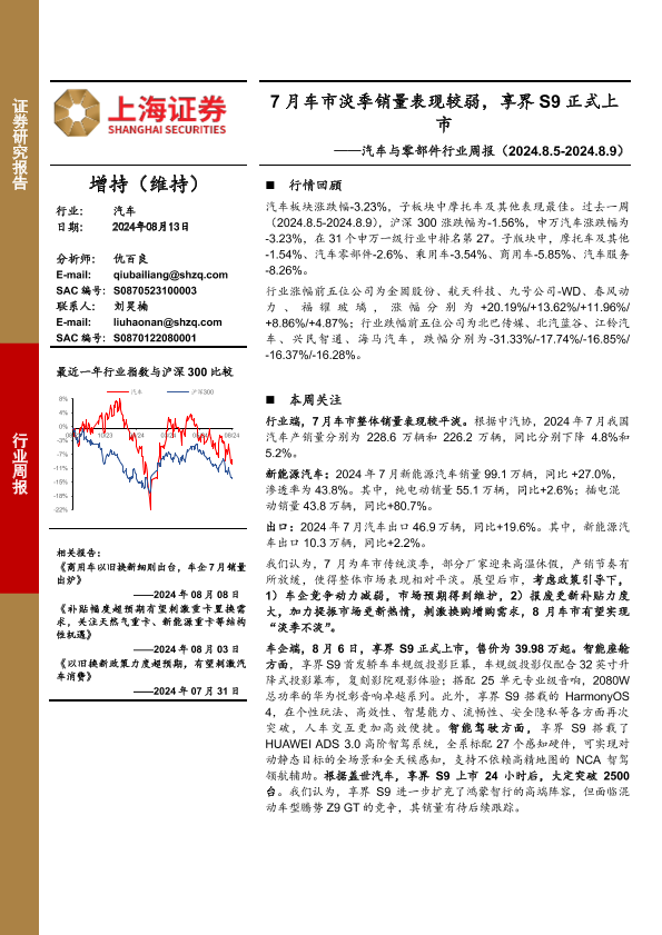 【上海证券】【20240813】20240813-上海证券-汽车与零部件行业周报:7月车市淡季销量表现较弱,享界S9正式上市-13页
