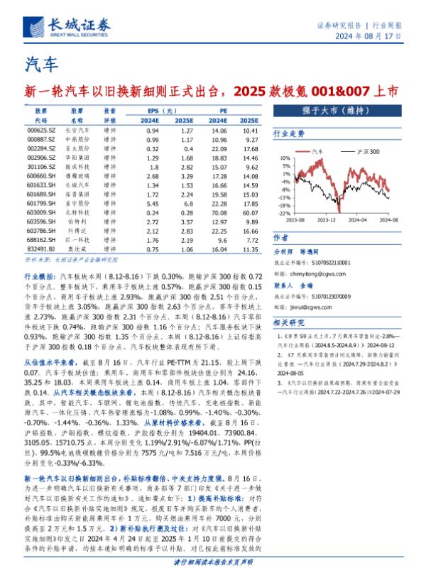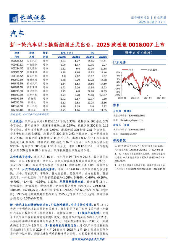 【长城证券】【20240817】20240817-长城证券-汽车行业周报:新一轮汽车以旧换新细则正式出台,2025款极氪001&007上市-12页