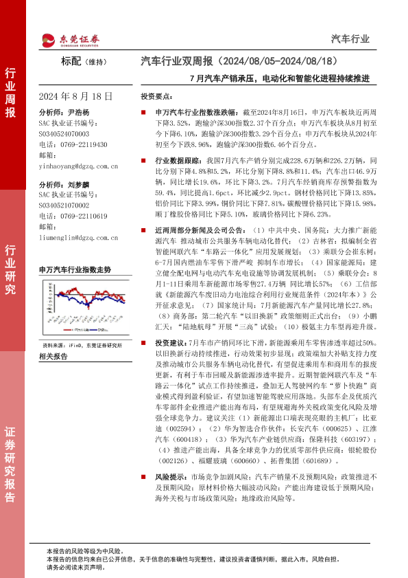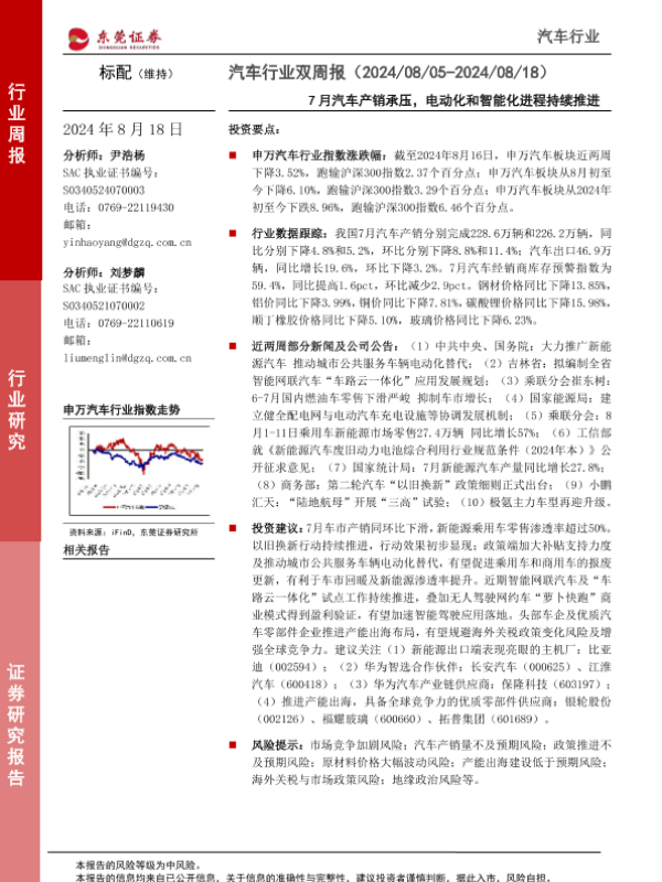 【东莞证券】【20240818】20240818-东莞证券-汽车行业双周报:7月汽车产销承压,电动化和智能化进程持续推进-13页
