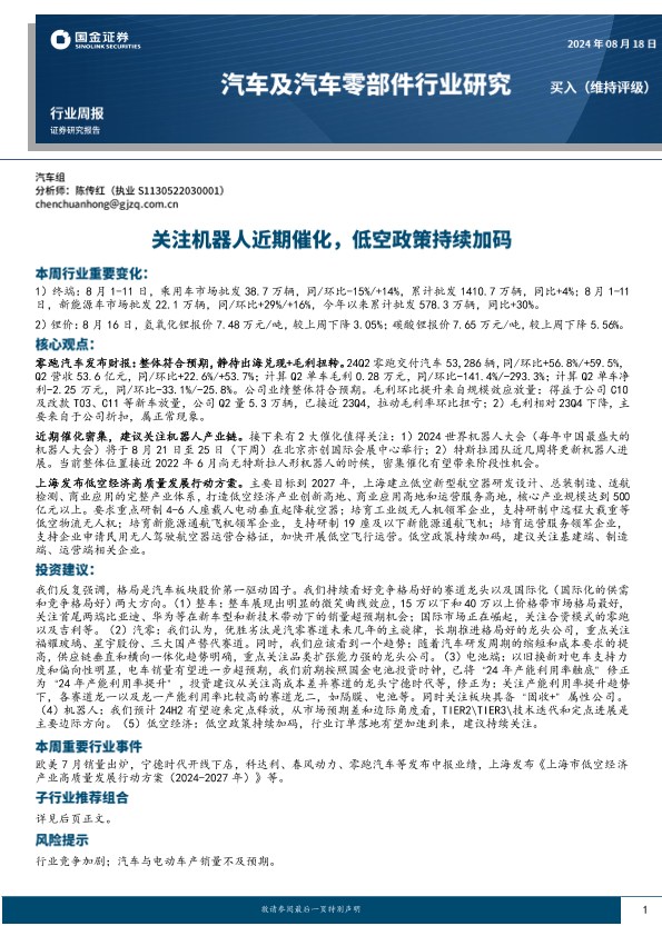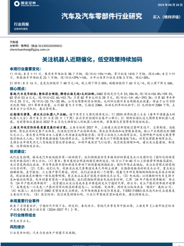 【国金证券】【20240818】汽车及汽车零部件行业研究:关注机器人近期催化,低空政策持续加码-12页