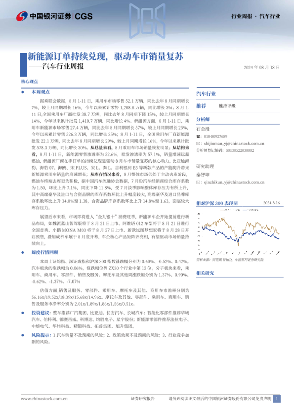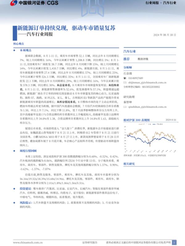 【银河证券】【20240818】中国汽车行业周报:新能源订单持续兑现,驱动车市销量复苏-12页