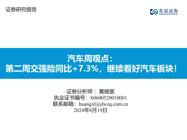 【东吴证券】【20240819】20240819-东吴证券-汽车周观点:第二周交强险同比+7.3%,继续看好汽车板块!-27页