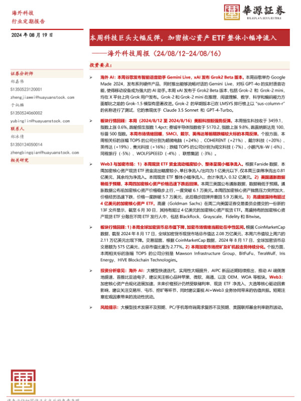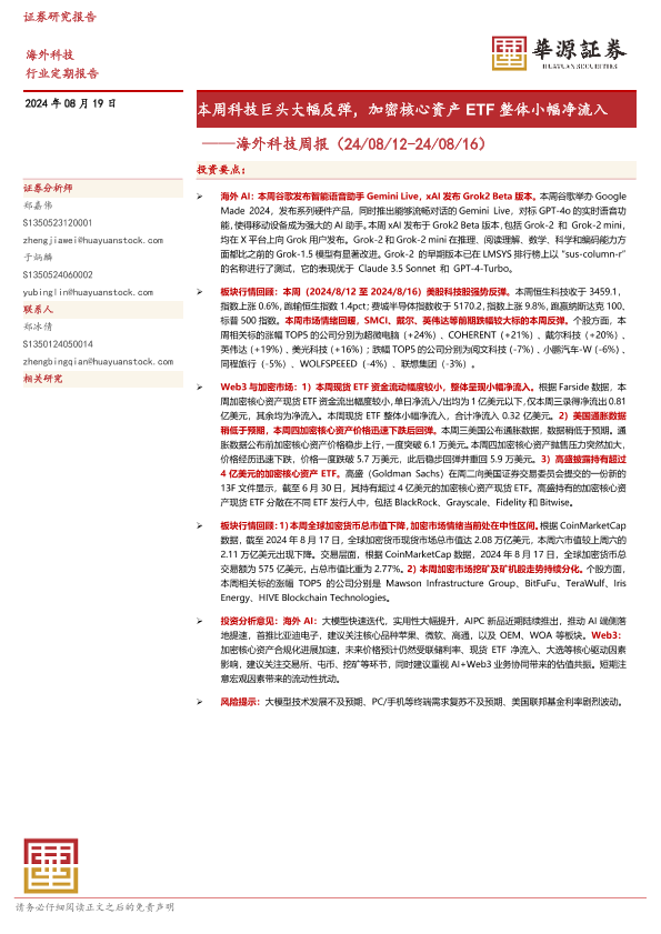 【华源证券】【20240819】20240819-华源证券-海外科技周报:本周科技巨头大幅反弹,加密核心资产ETF整体小幅净流入-12页