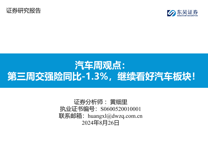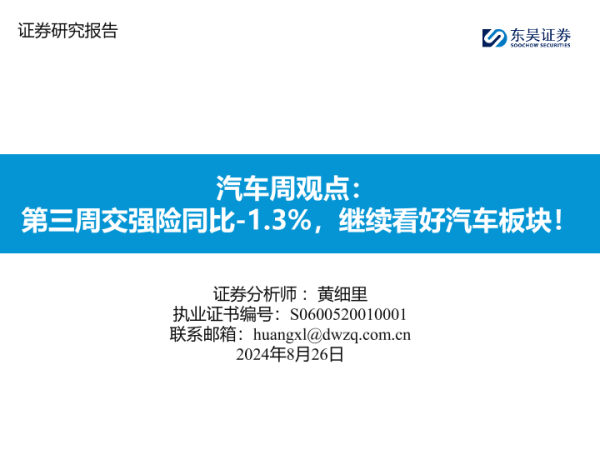 【东吴证券】【20240826】20240826-东吴证券-汽车周观点:第三周交强险同比-1.3%,继续看好汽车板块!-27页