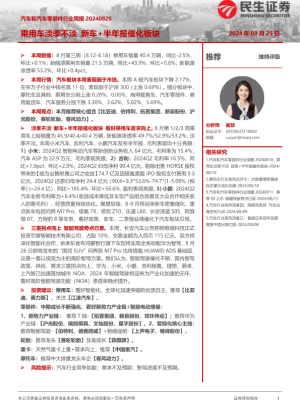【民生证券】【20240825】汽车和汽车零部件行业周报:乘用车淡季不淡 新车+半年报催化板块-32页