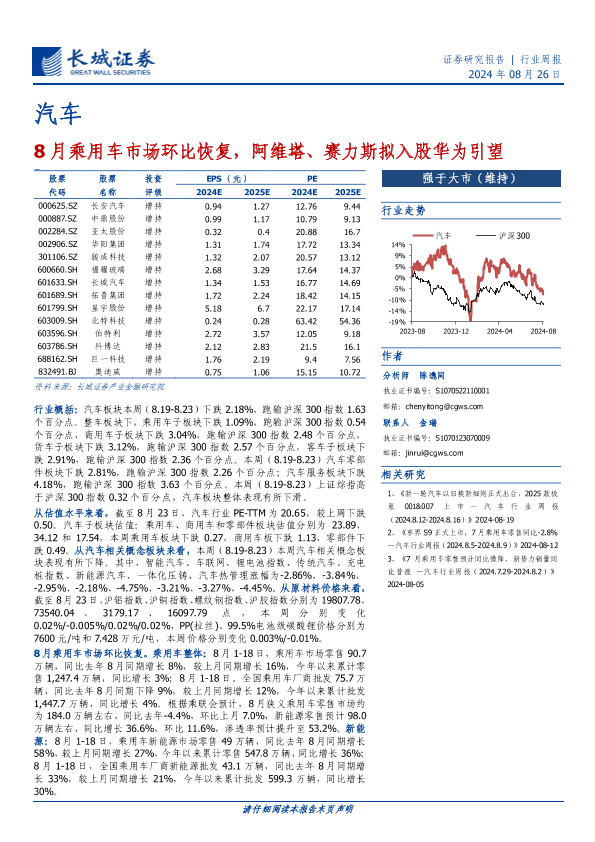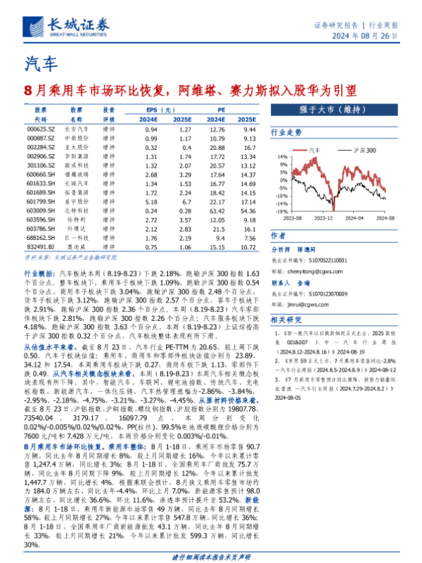【长城证券】【20240826】20240826-长城证券-汽车行业周报:8月乘用车市场环比恢复,阿维塔、赛力斯拟入股华为引望-15页