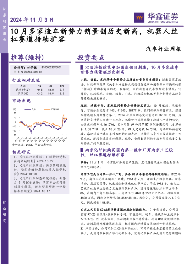 【华鑫证券】【20241103】20241103-华鑫证券-汽车行业周报:10月多家造车新势力销量创历史新高,机器人丝杠赛道持续扩容-19页