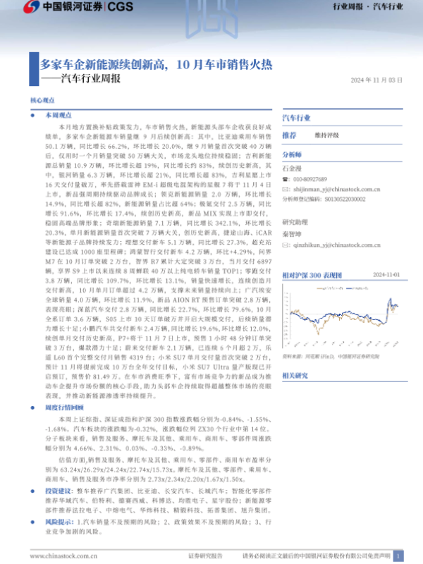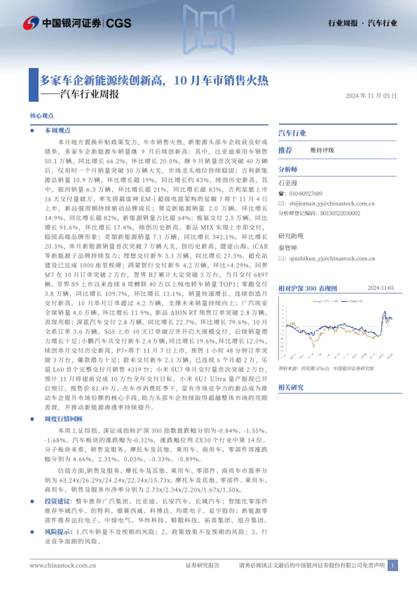 【银河证券】【20241103】20241103-中国银河-汽车行业周报:多家车企新能源续创新高,10月车市销售火热-29页