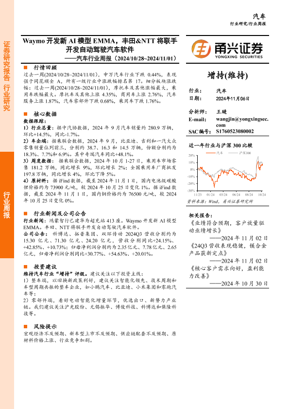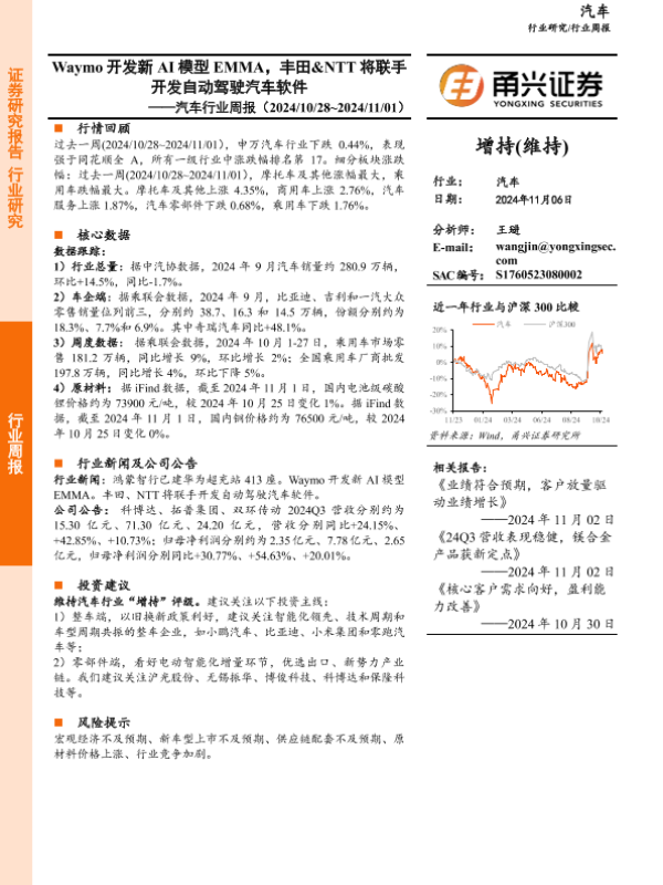 【甬兴证券】【20241106】20241106-甬兴证券-汽车行业周报:Waymo开发新AI模型EMMA,丰田&NTT将联手开发自动驾驶汽车软件-12页