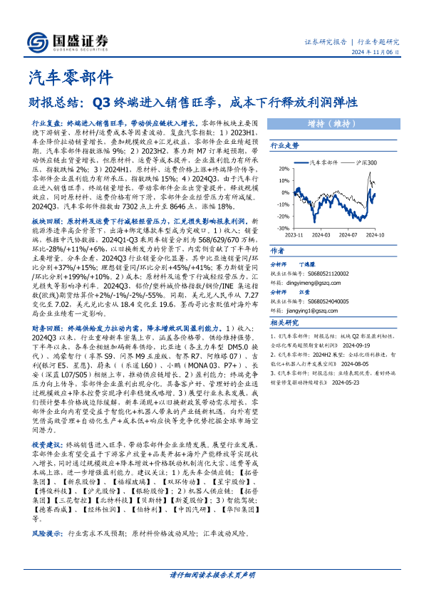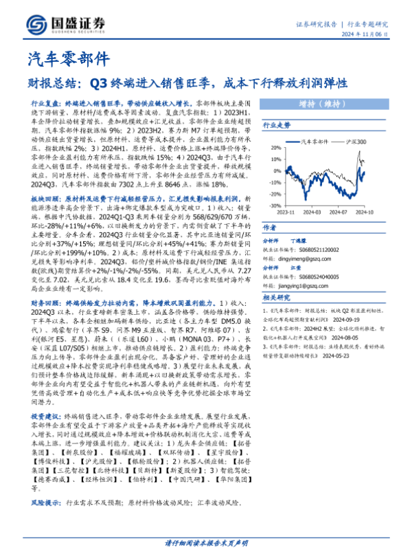 【国盛证券】【20241106】汽车零部件财报总结:Q3终端进入销售旺季,成本下行释放利润弹性-25页