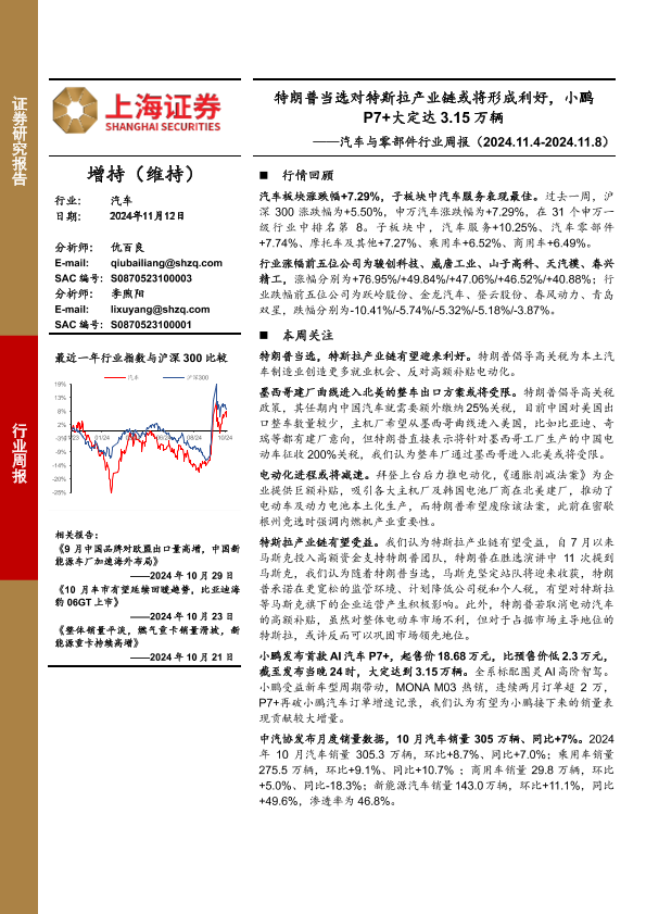 【上海证券】【20241112】20241112-上海证券-汽车与零部件行业周报:特朗普当选对特斯拉产业链或将形成利好,小鹏P7+大定达3.15万辆-12页