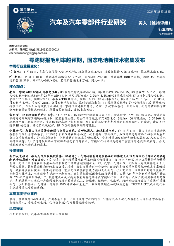 【国金证券】【20241116】汽车及汽车零部件行业研究:零跑财报毛利率超预期,固态电池新技术密集发布-12页