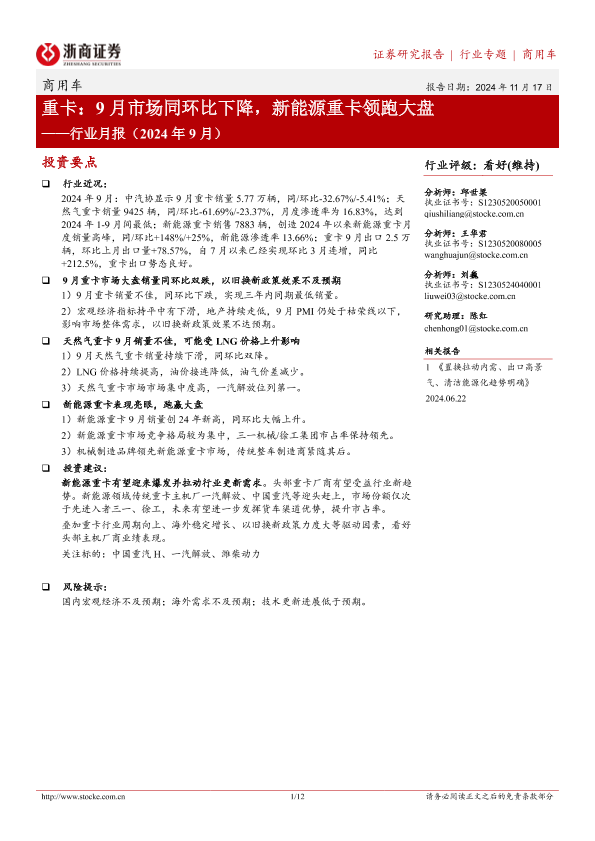 【浙商证券】【20241117】20241117-浙商证券-商用车行业月报(2024年9月):重卡:9月市场同环比下降,新能源重卡领跑大盘-12页