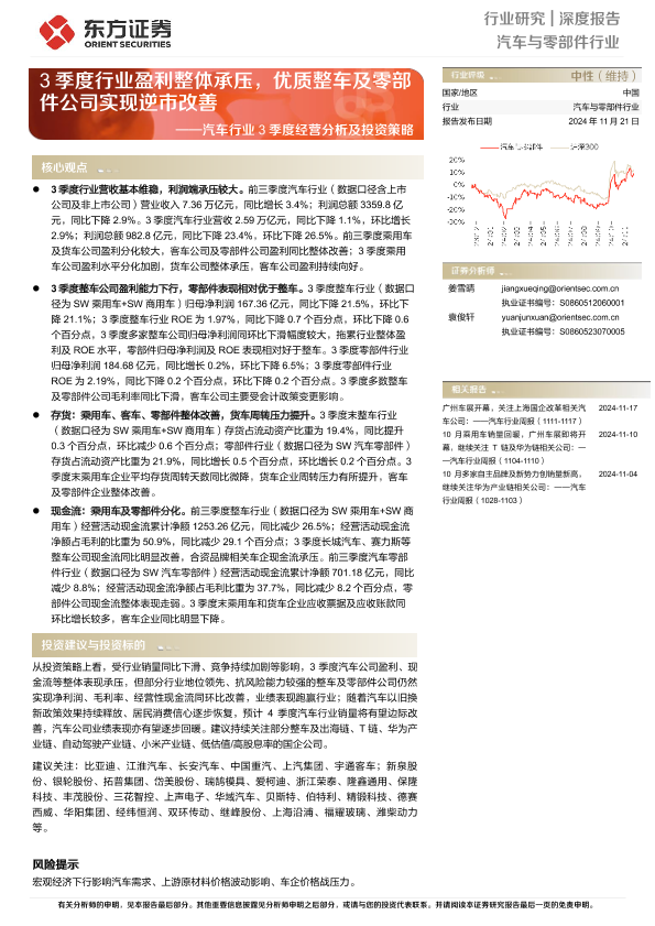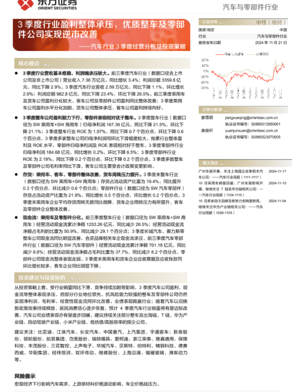 【东方证券】【20241121】20241121-东方证券-汽车行业3季度经营分析及投资策略:3季度行业盈利整体承压,优质整车及零部件公司实现逆市改善-23页