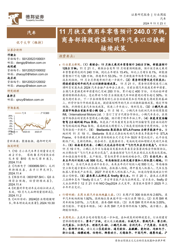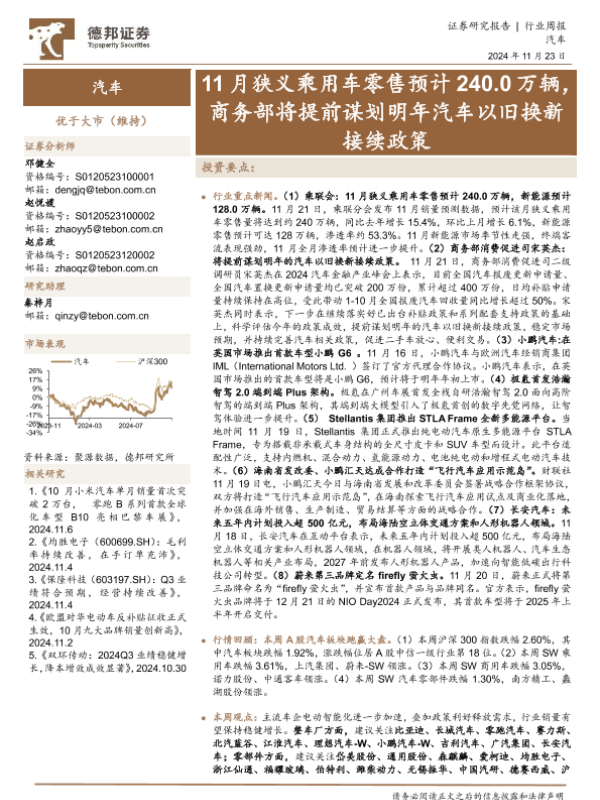【德邦证券】【20241123】20241123-德邦证券-汽车行业周报:11月狭义乘用车零售预计240.0万辆,商务部将提前谋划明年汽车以旧换新接续政策-12页