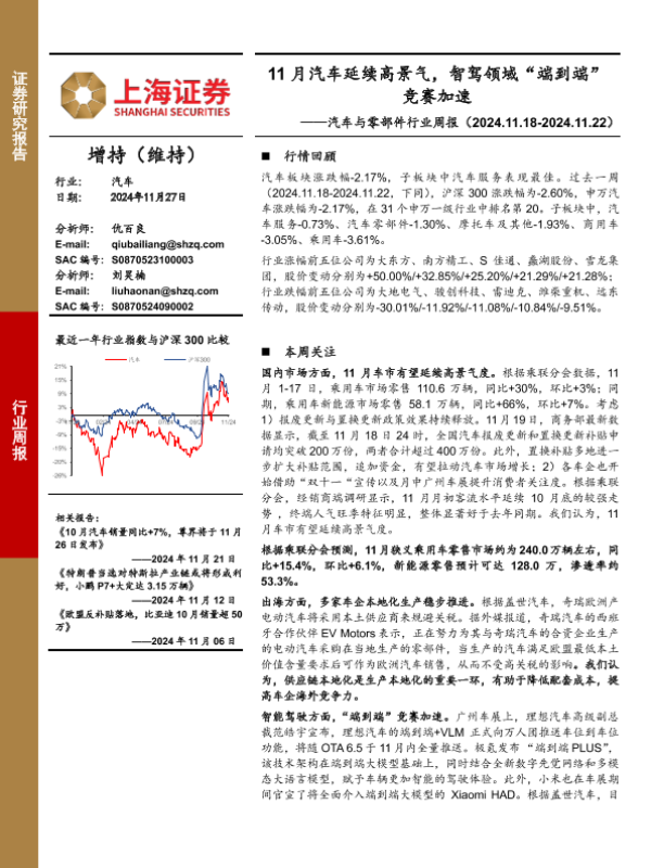 【上海证券】【20241127】11月汽车延续高景气,智驾领域“端到端”竞赛加速-11页