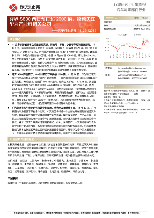 【东方证券】【20241201】20241201-东方证券-汽车行业周报:尊界S800两日预订超2000辆,继续关注华为产业链相关公司-17页