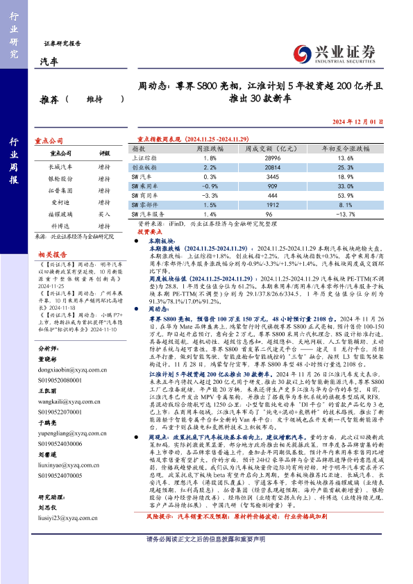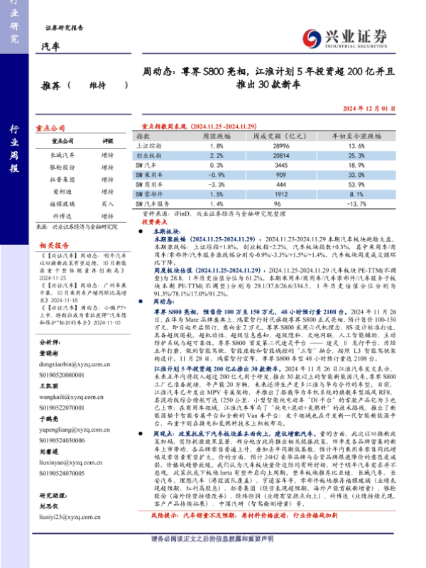 【兴业证券】【20241201】周动态:尊界 S800亮相,江淮计划 5年投资超200亿并且推出30款新车-11页
