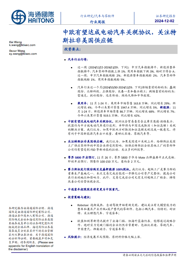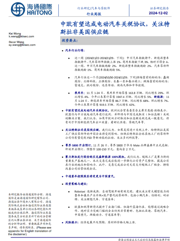 【海通国际】【20241202】汽车与零配件行业周报:中欧有望达成电动汽车关税协议,关注特斯拉非美国供应链-13页