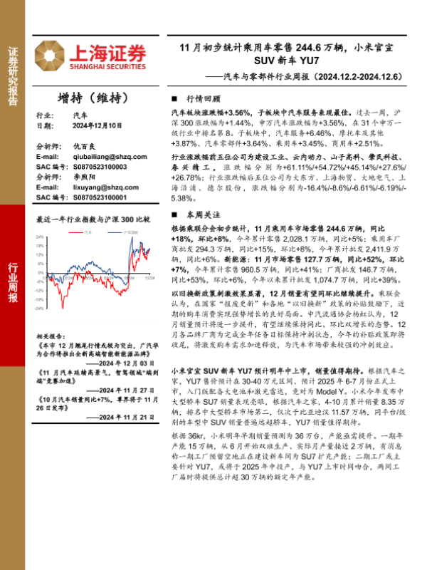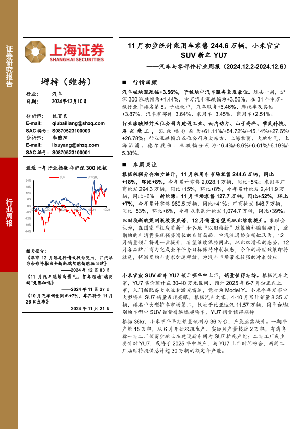 【上海证券】【20241210】20241210-上海证券-汽车与零部件行业周报:11月初步统计乘用车零售244.6万辆,小米官宣SUV新车YU7-11页