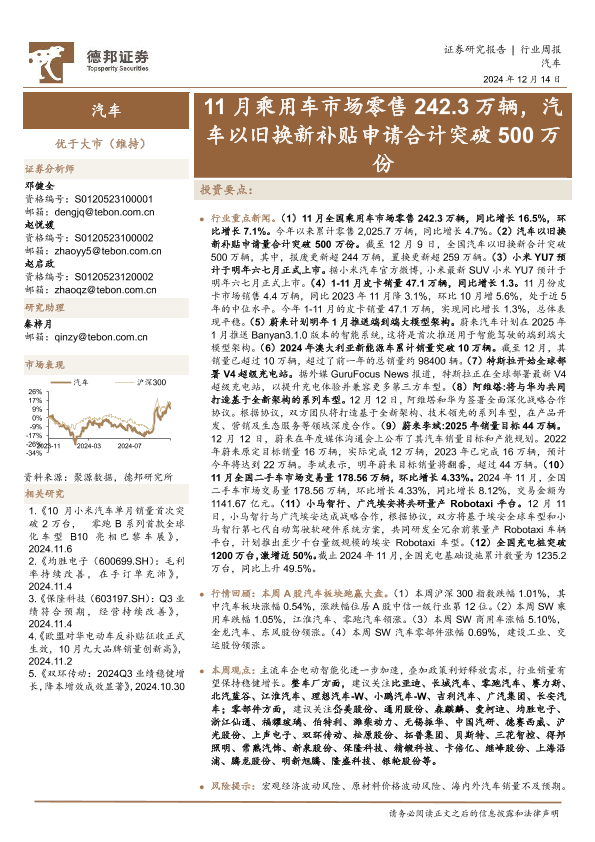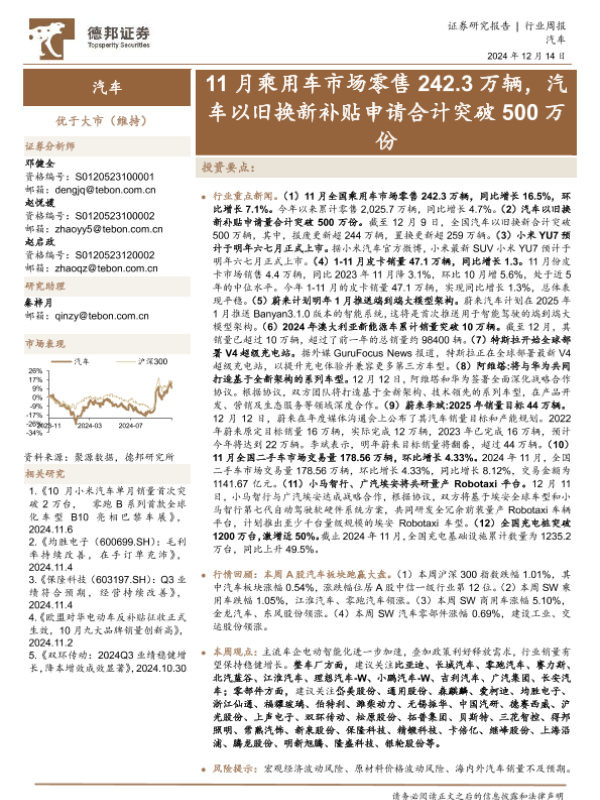 【德邦证券】【20241214】20241214-德邦证券-汽车行业周报:11月乘用车市场零售242.3万辆,汽车以旧换新补贴申请合计突破500万份-11页