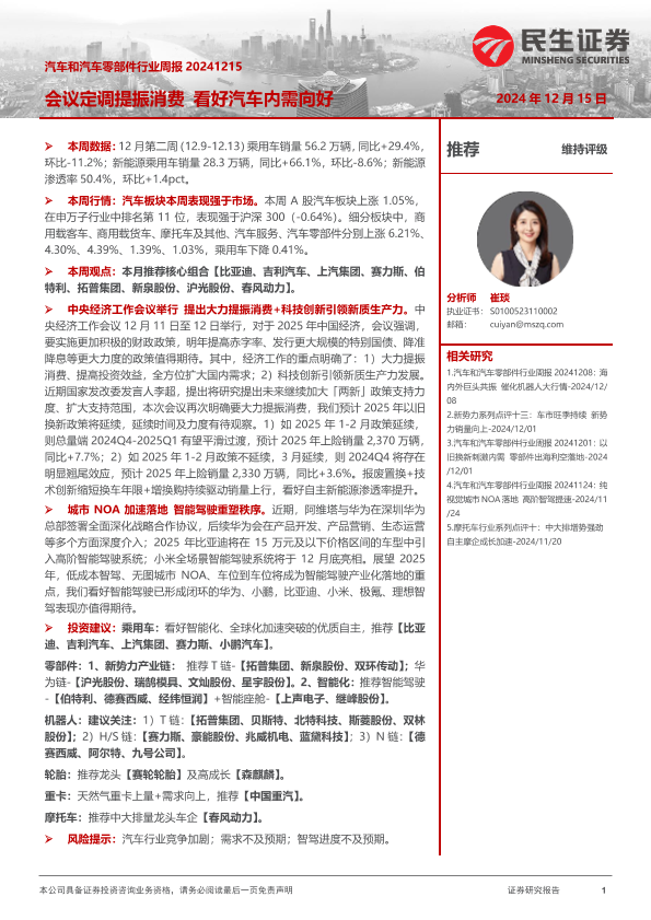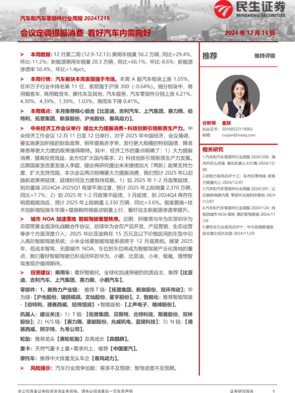 【民生证券】【20241215】汽车和汽车零部件行业周报:会议定调提振消费 看好汽车内需向好-31页