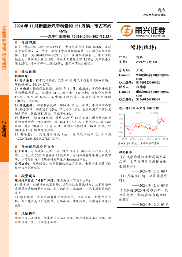 【甬兴证券】【20241216】2024年11月新能源汽车销量约151万辆,市占率约46%-12页