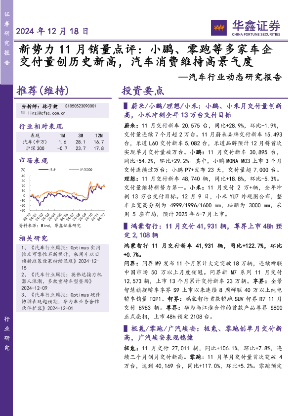 【华鑫证券】【20241218】新势力11月销量点评:小鹏、零跑等多家车企交付量创历史新高,汽车消费维持高景气度-14页