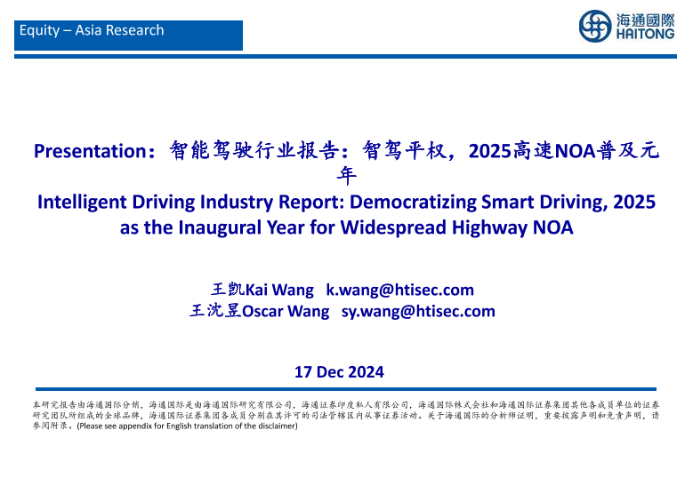 【海通国际】【20241217】智能驾驶行业报告:智驾平权,2025高速NOA普及元年-40页