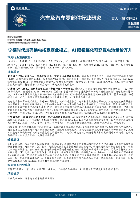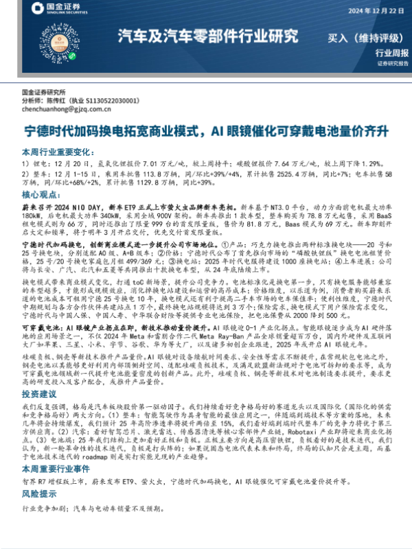 【国金证券】【20241222】汽车及汽车零部件行业周报:宁德时代加码换电拓宽商业模式,AI眼镜催化可穿戴电池量价齐升-12页