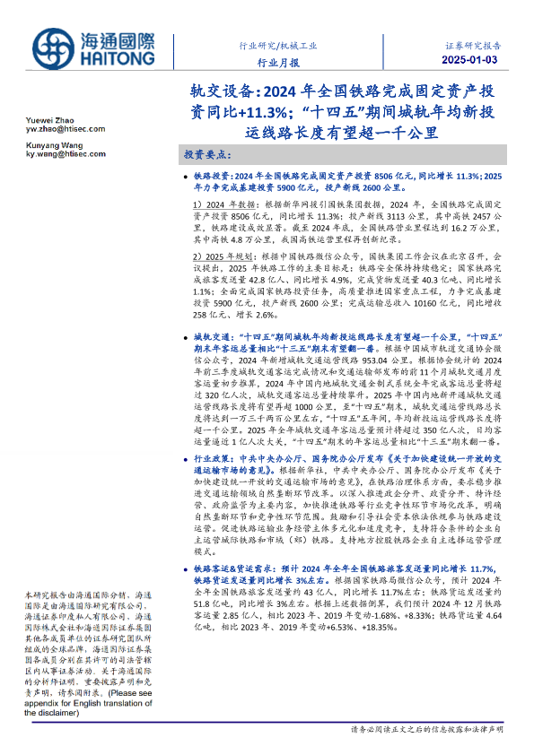 【海通国际】【20250103】轨交设备:2024年全国铁路完成固定资产投资同比+11.3%;“十四五”期间城轨年均新投运线路长度有望超一千公里-12页