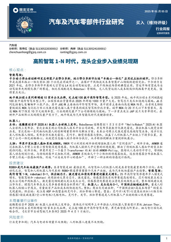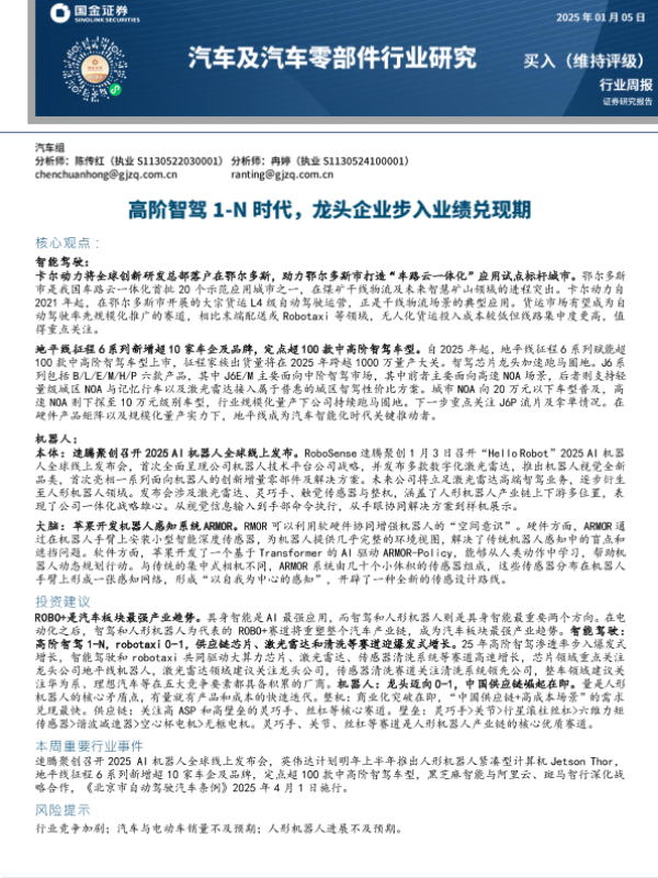 【国金证券】【20250105】汽车及汽车零部件行业周报:高阶智驾1~N时代,龙头企业步入业绩兑现期-12页