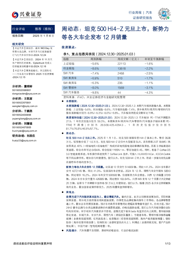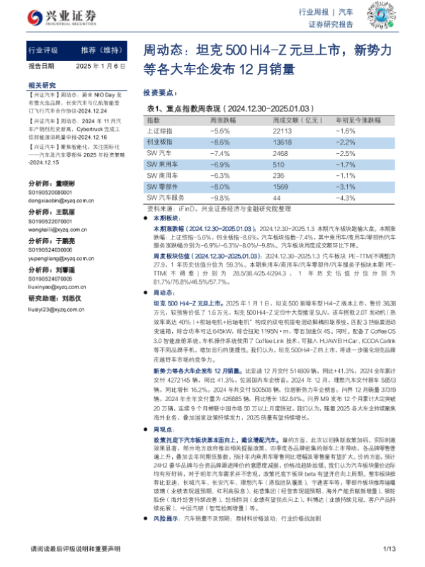 【兴业证券】【20250106】汽车周动态:坦克500 Hi4-Z元旦上市,新势力等各大车企发布12月销量-13页