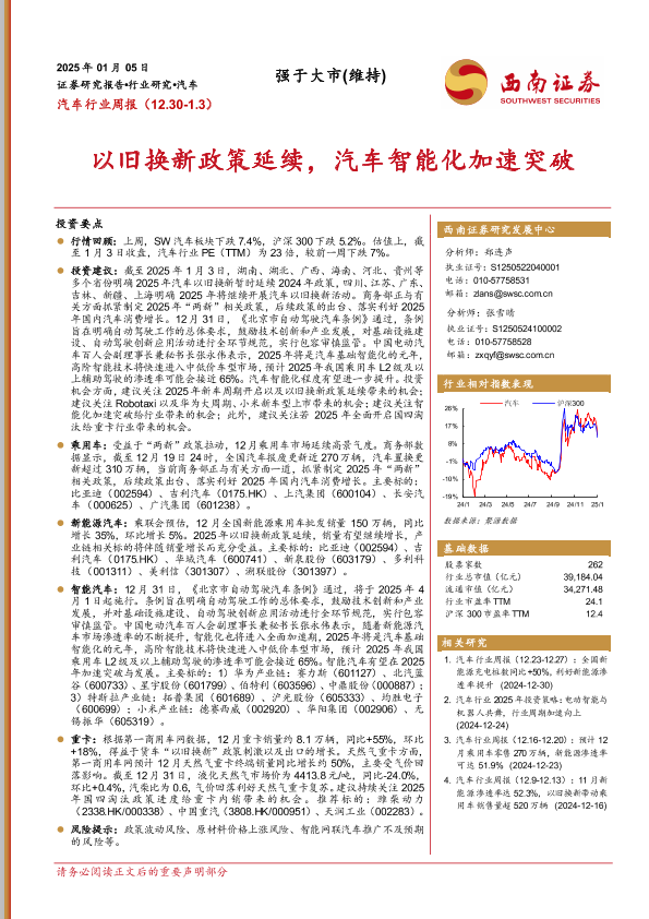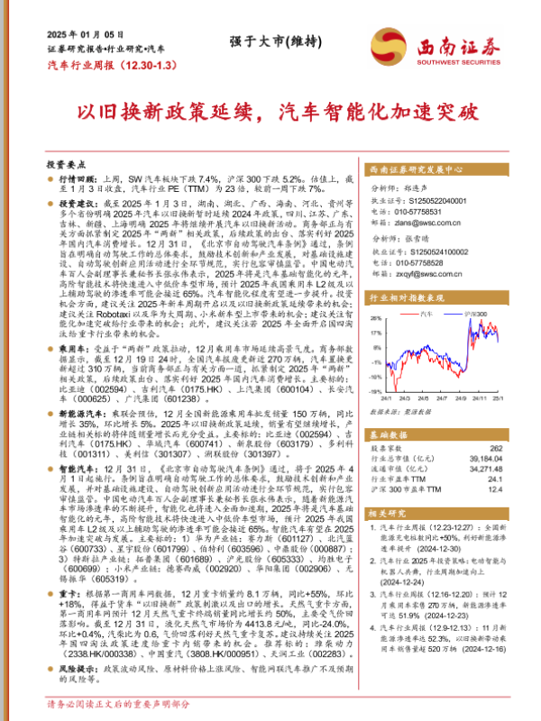 【西南证券】【20250105】汽车行业周报:以旧换新政策延续,汽车智能化加速突破-19页