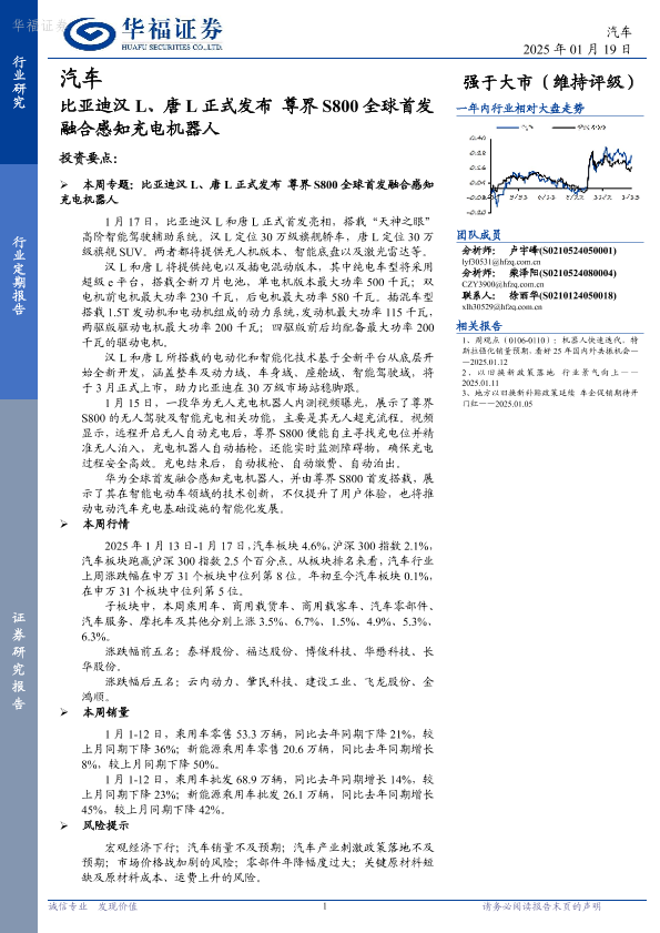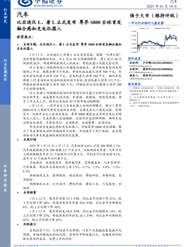 【华福证券】【20250119】20250119-华福证券-汽车行业定期报告:比亚迪汉L、唐L正式发布 尊界S800全球首发融合感知充电机器人-12页