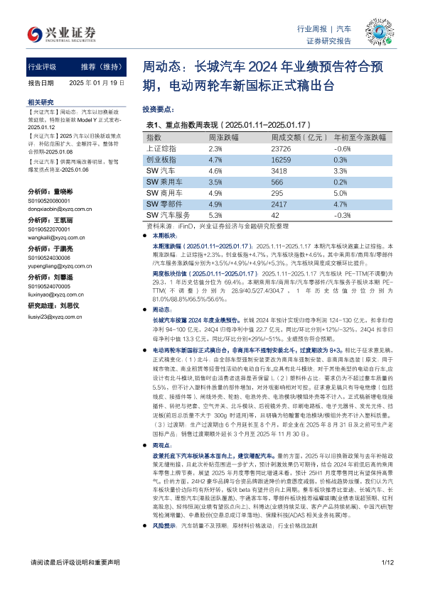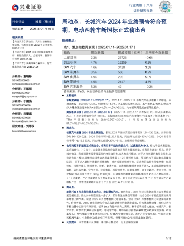 【兴业证券】【20250119】汽车周动态:长城汽车2024年业绩预告符合预期,电动两轮车新国标正式稿出台-12页