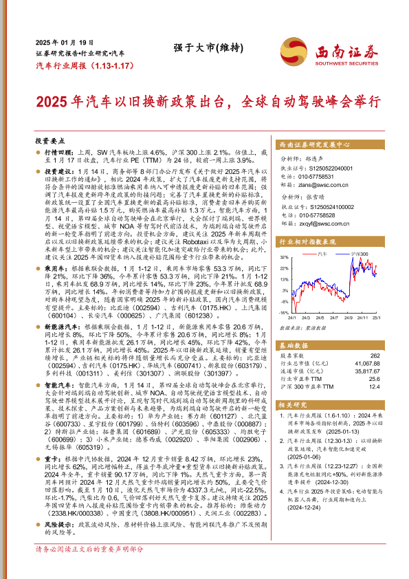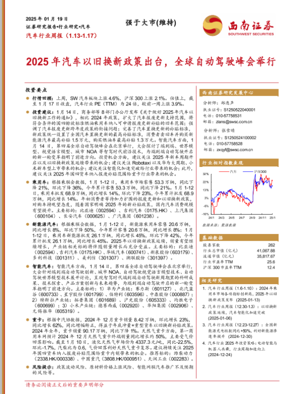 【西南证券】【20250119】2025年汽车以旧换新政策出台,全球自动驾驶峰会举行-19页